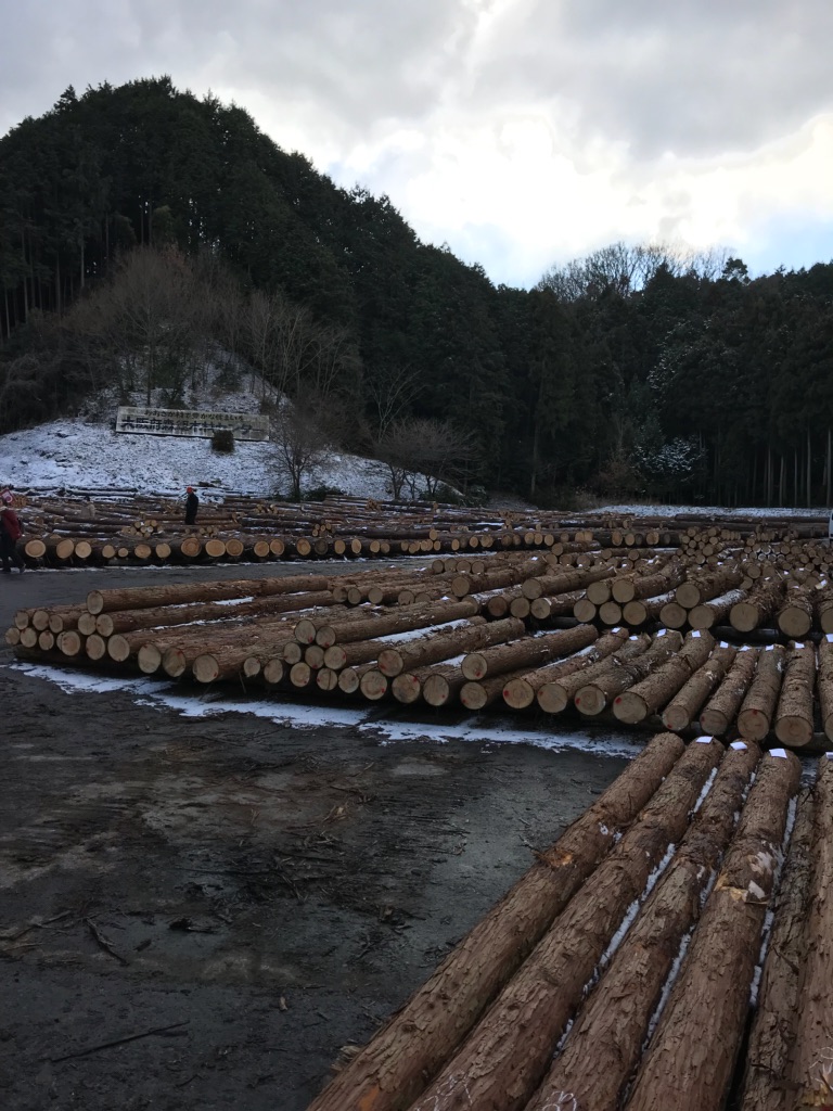 昨日の雪が積もる中、原木がずらりと並んでおります!!