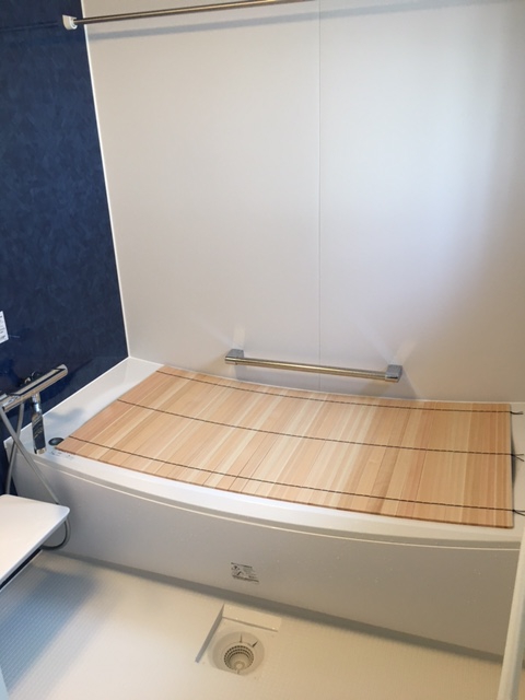 桧でできたフロフタで、入浴時に桧の香りに包まれるので桧風呂感覚でお風呂に入れます。(^^)