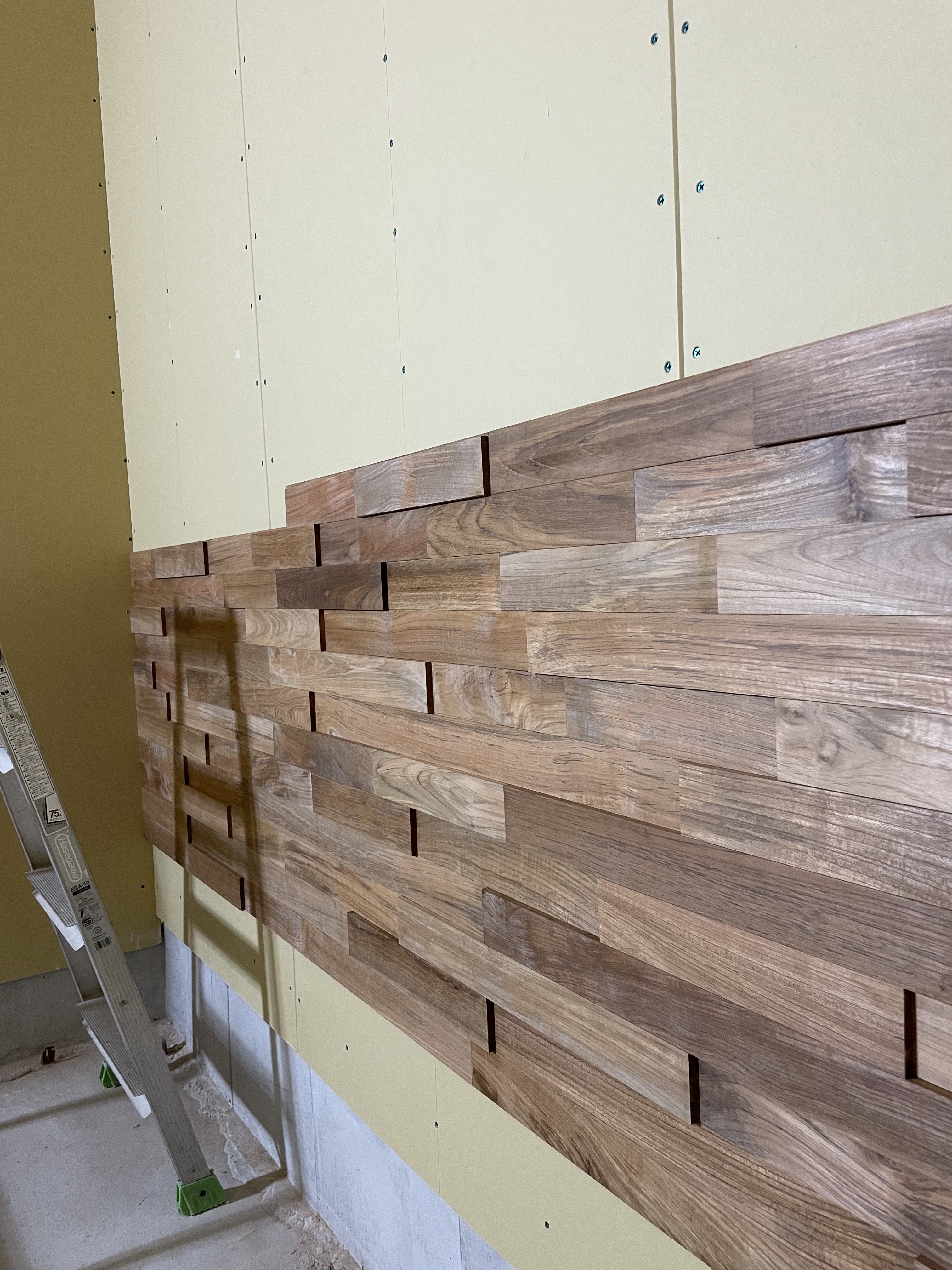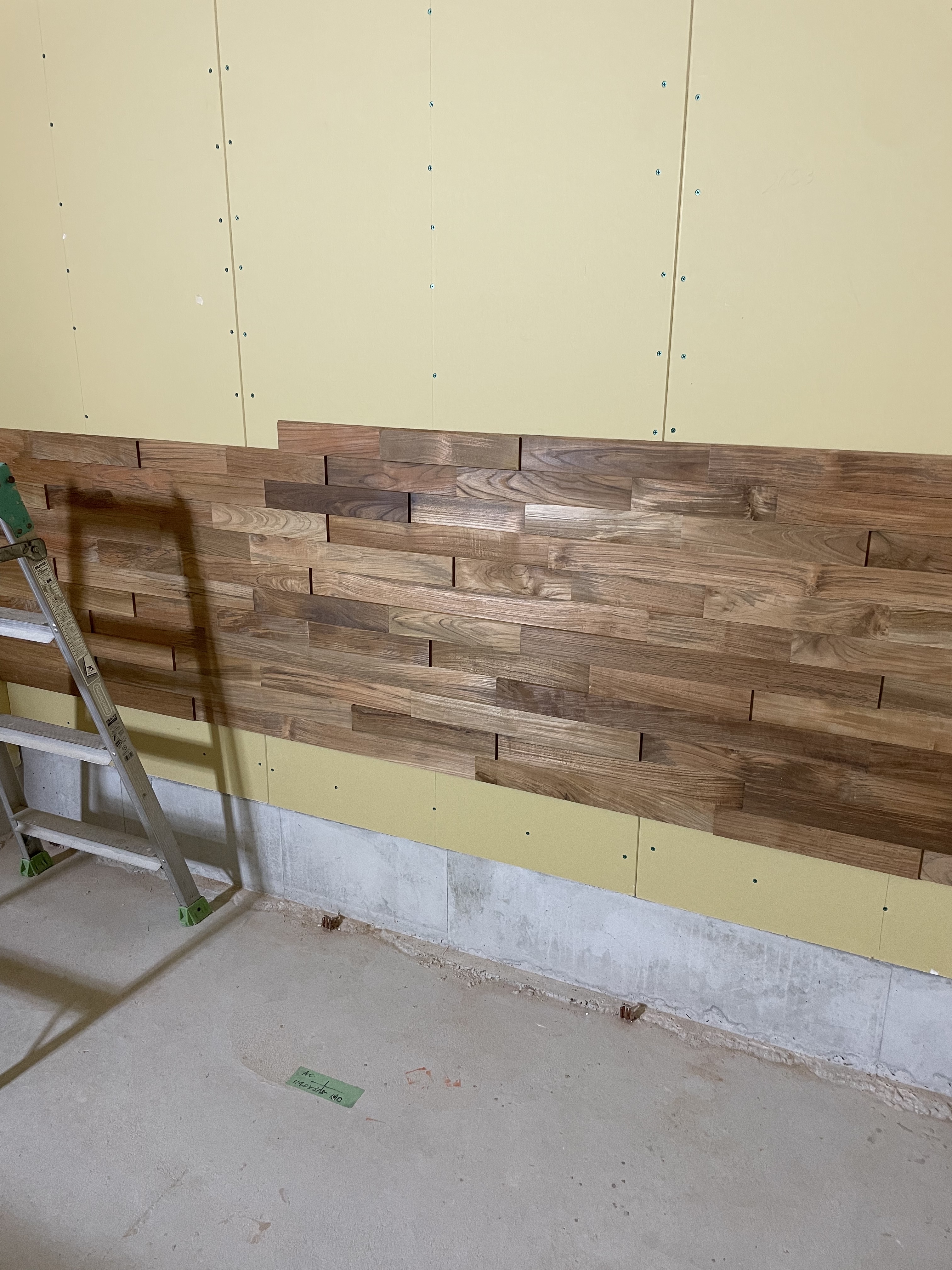 一枚一枚ランダムに貼っていきます。木目や色味が違うので、どの板を選び、貼っていくのかもセンスですね。
