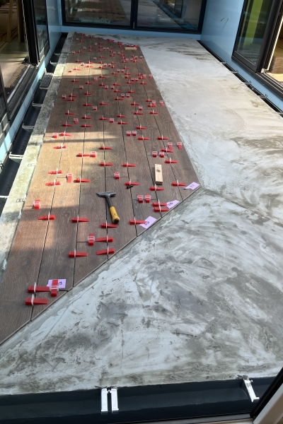 中庭のタイル施工 タイルの目地詰めをして仕上げます。 完成