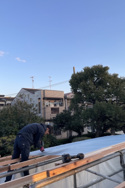 段階的に工事を進めていくので、一時的な仮屋根をつくっています…